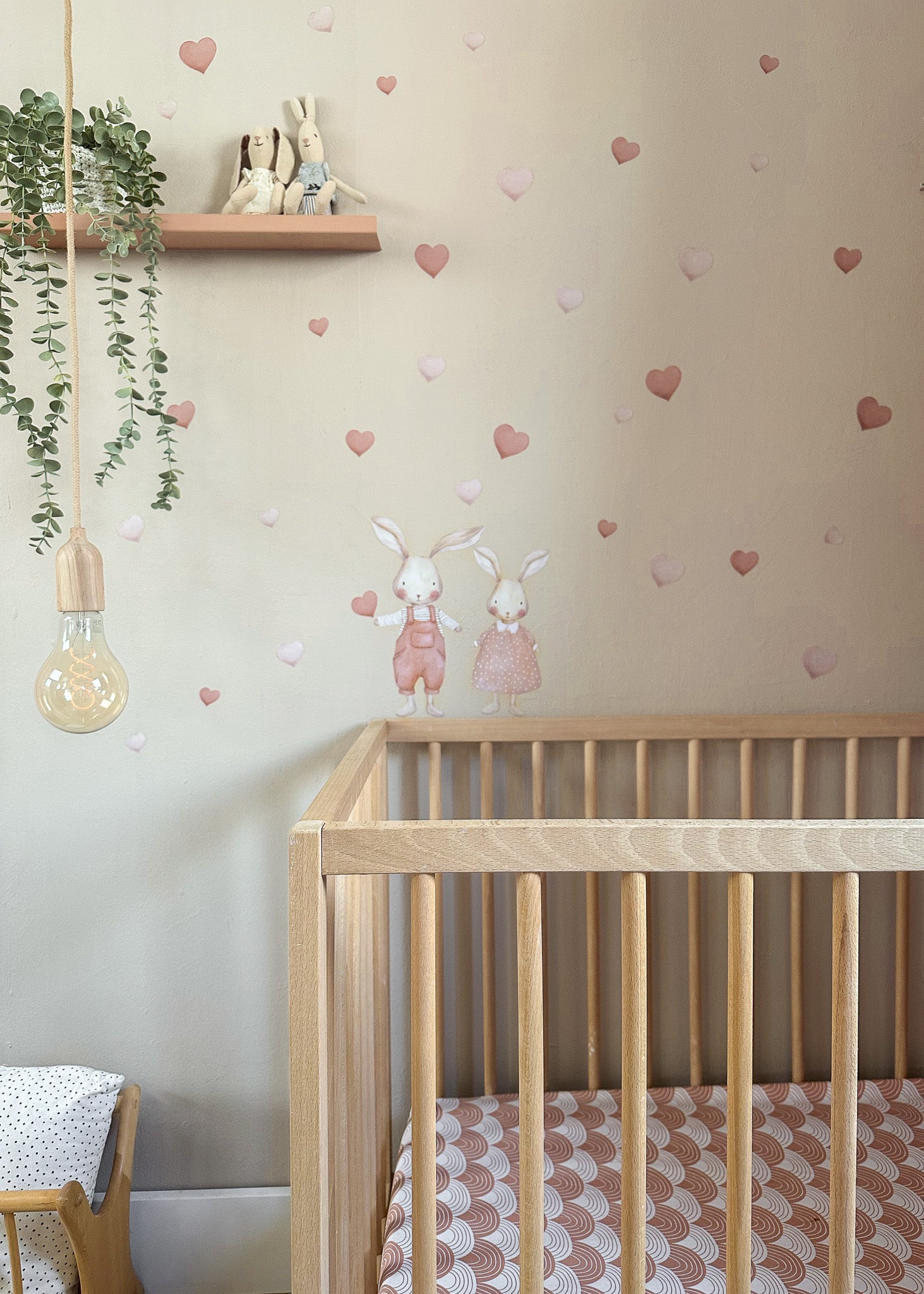 Twee schattige konijntjes met hartjes. De hartjes zijn in twee kleuren.
